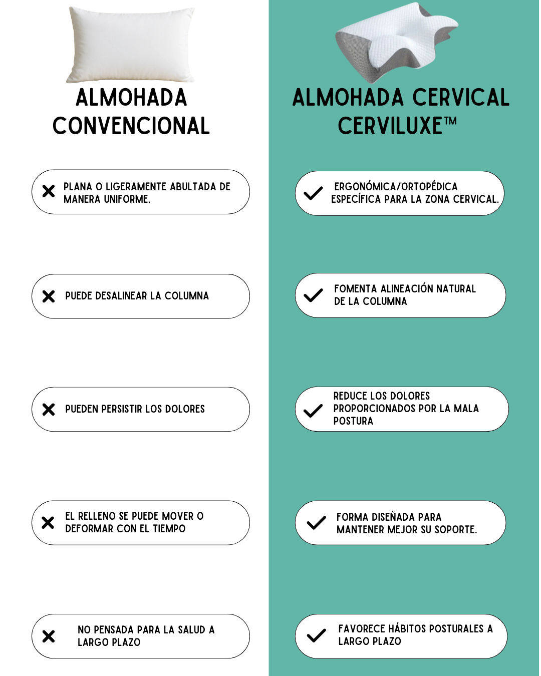 Con la almohada cervical ergonómica CerviLuxe™ (viscoelástica premium + doble curva anatómica):